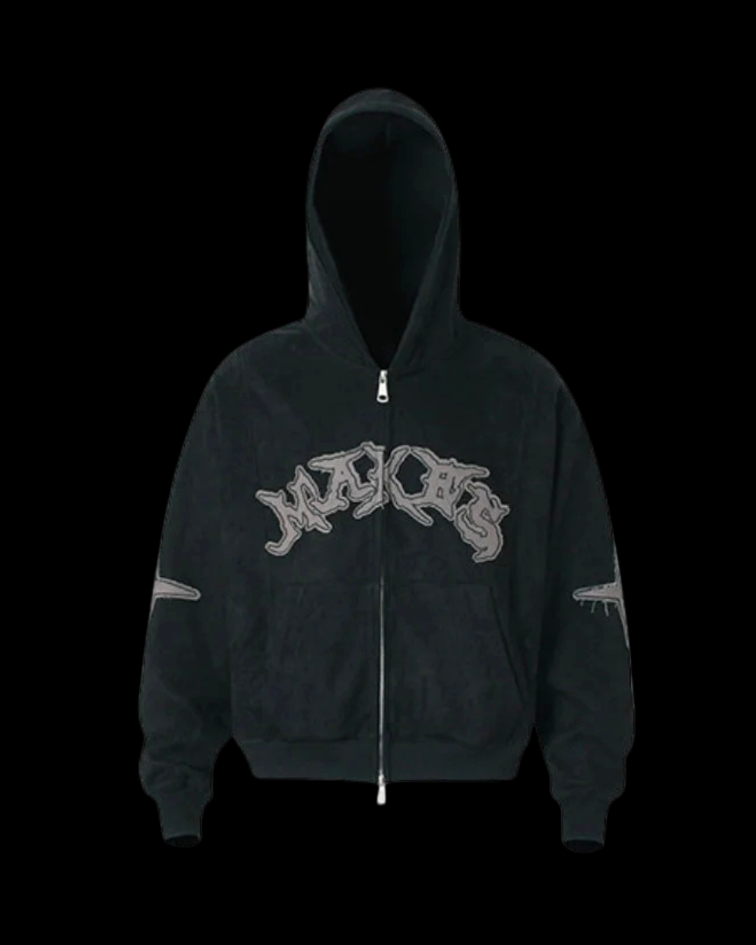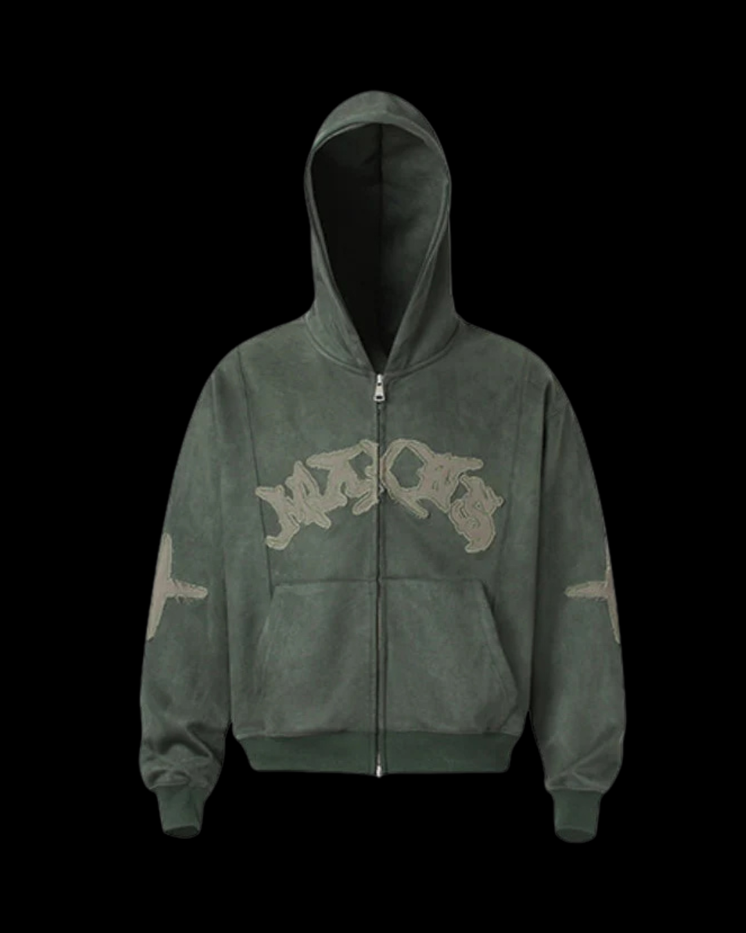 Vintage-wash zip-up hoodie featuring a bold arched gothic logo across the chest with subtle cross accents on both sleeves. The faded dye treatment gives each colorway a worn, archival feel, available in washed olive, deep charcoal, and muted rose tones for versatile everyday styling. Finished with a full front zipper, adjustable hood, and relaxed silhouette for easy layering. Blend, true to size, and ready to ship.