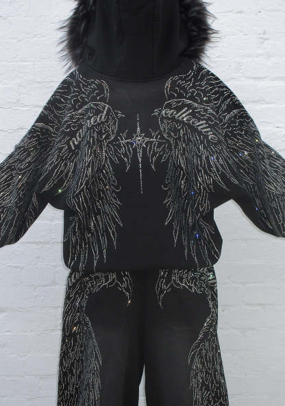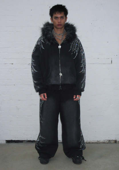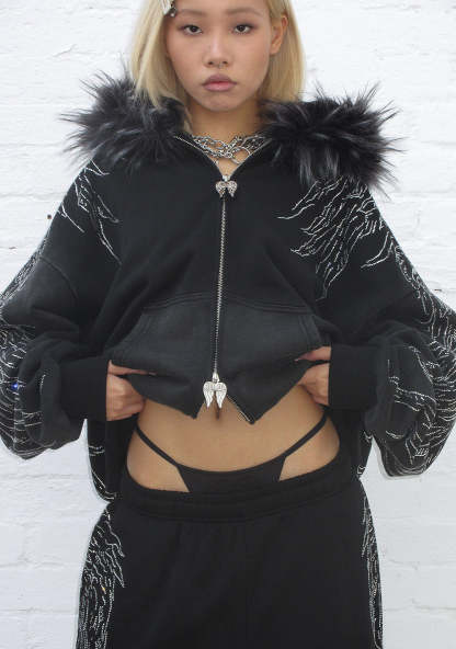FALLEN FAUX FUR RHINESTONE ZIP HOODIE WASHED BLACK (DETACHABLE FUR)