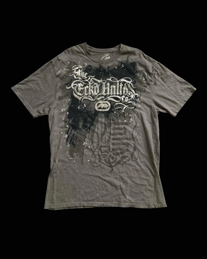 Charcoal-grey short-sleeve tee with oversized Ecko Unltd inspired gothic script, paint-splatter and brush-stroke print, and rhino logo at the chest. Soft feel, relaxed fit, easy to style. Cotton blend, true to size, and ready to ship.