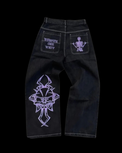 Washed black denim with contrast bone-white graphics—“Heaven Can Wait” script, skeleton art, and a tribal cross down the leg. Relaxed straight fit with classic 5-pocket construction and zip fly. Also available in purple and red. Cotton blend, true to size, and ready to ship.