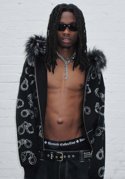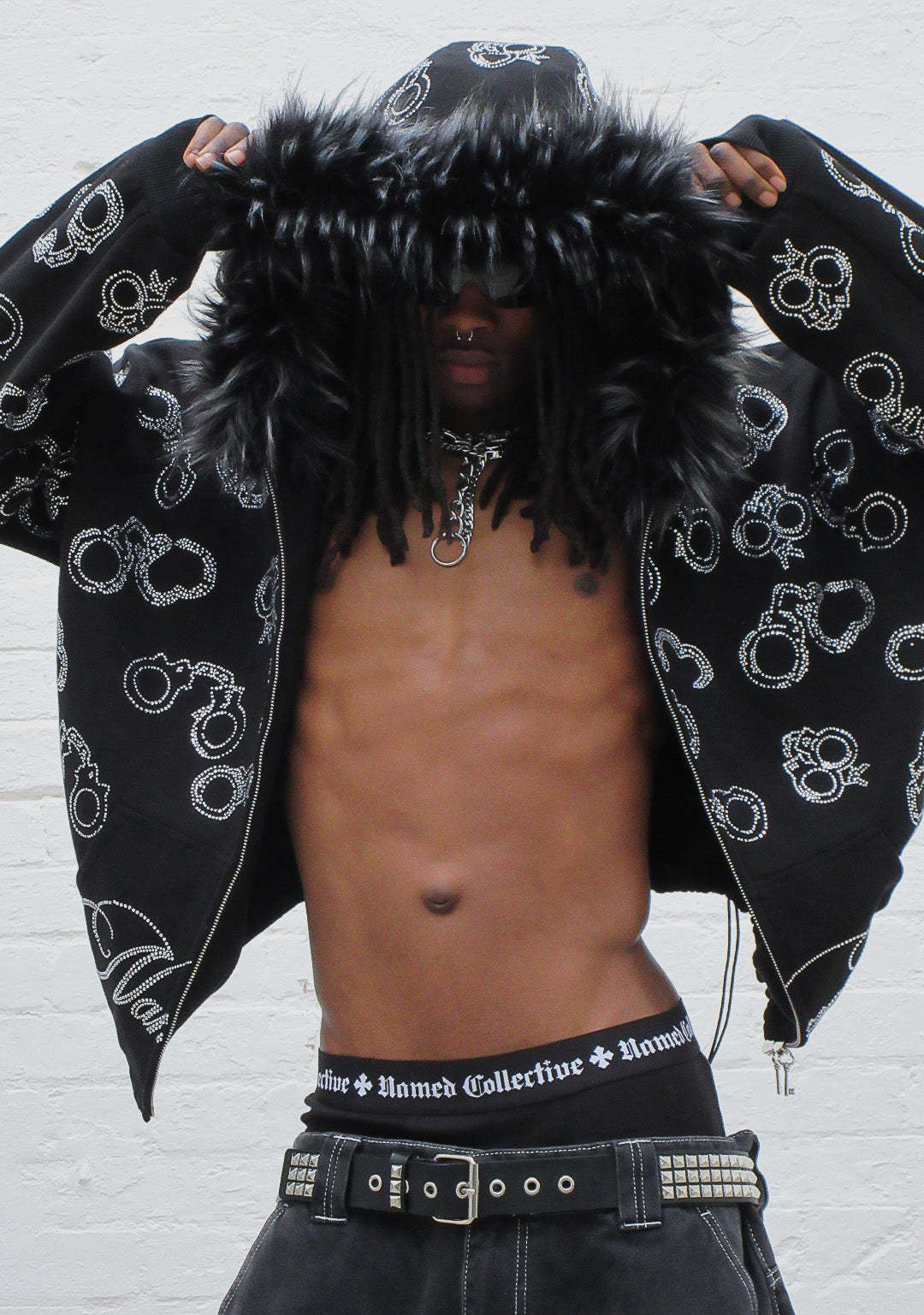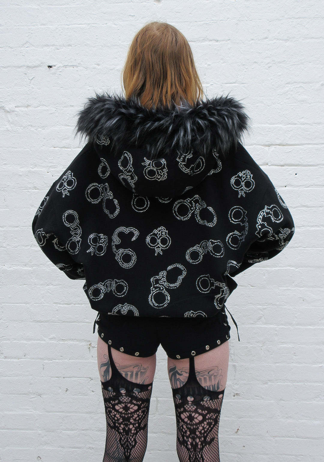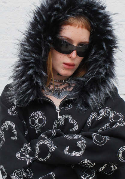HEIST FAUX FUR RHINESTONE CUFF ZIP HOODIE BLACK (DETACHABLE FUR)