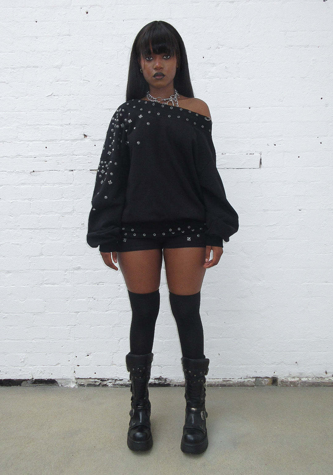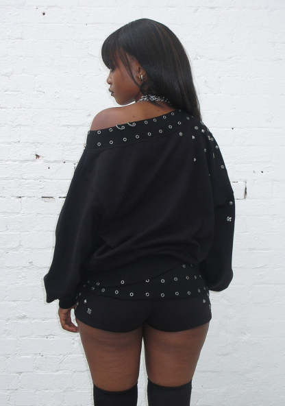 MIDNIGHT STUDDED OFF THE SHOULDER SWEATER BLACK