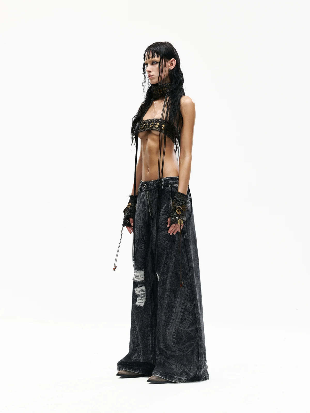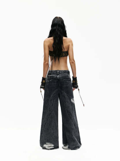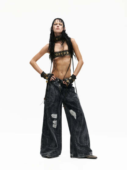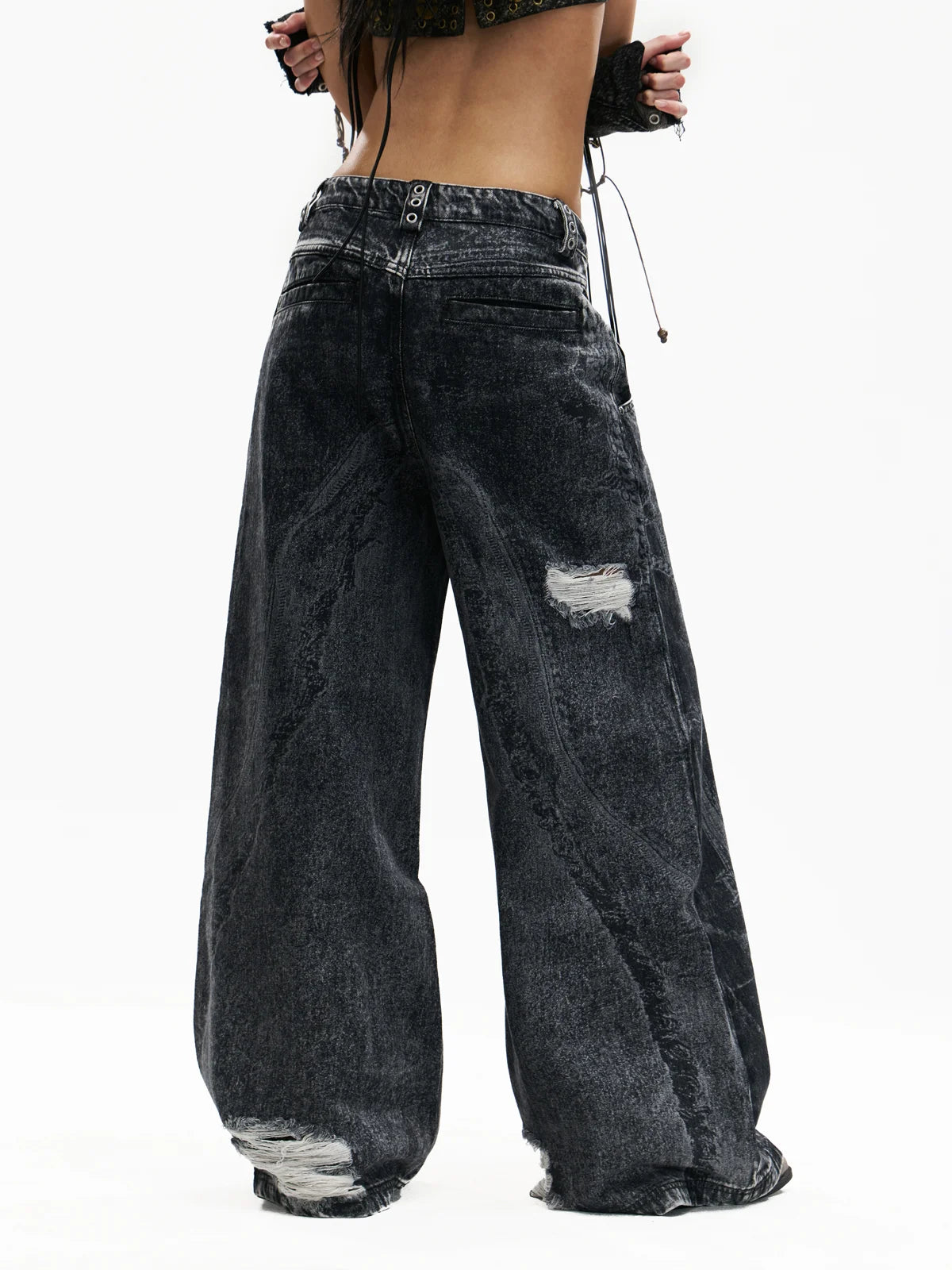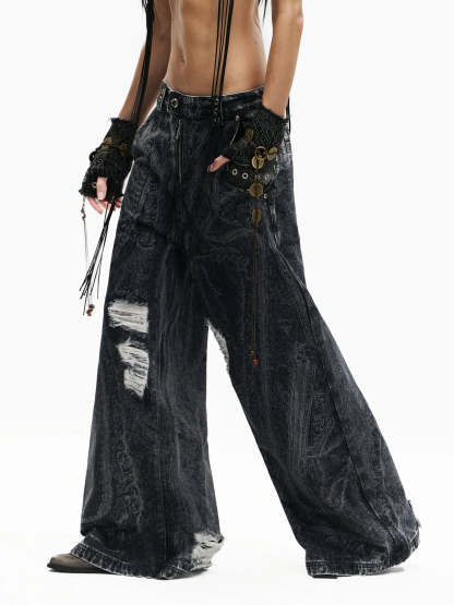 Personsoul Textured Black Print Ripped Jeans