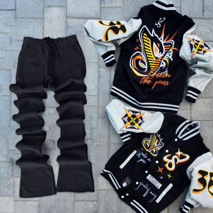 Stylish contrasting color baseball jacket and flared pants suit
